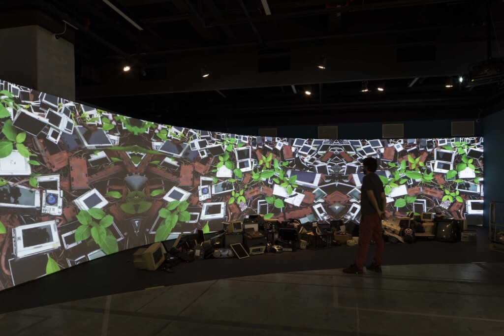 Corrosive Beauty questions the environmental impacts of digital technologies through dystopian images of a likely future in which rivers are overtaken by dysfunctional equipment of all kinds. In the projection, which depicts an imaginary Amazon River, landscapes marked by the contrast between the organic and the technological evoke a state of corrosive beauty — a direct allusion to André Breton’s surrealist concept/verse of convulsive beauty, but in reverse.