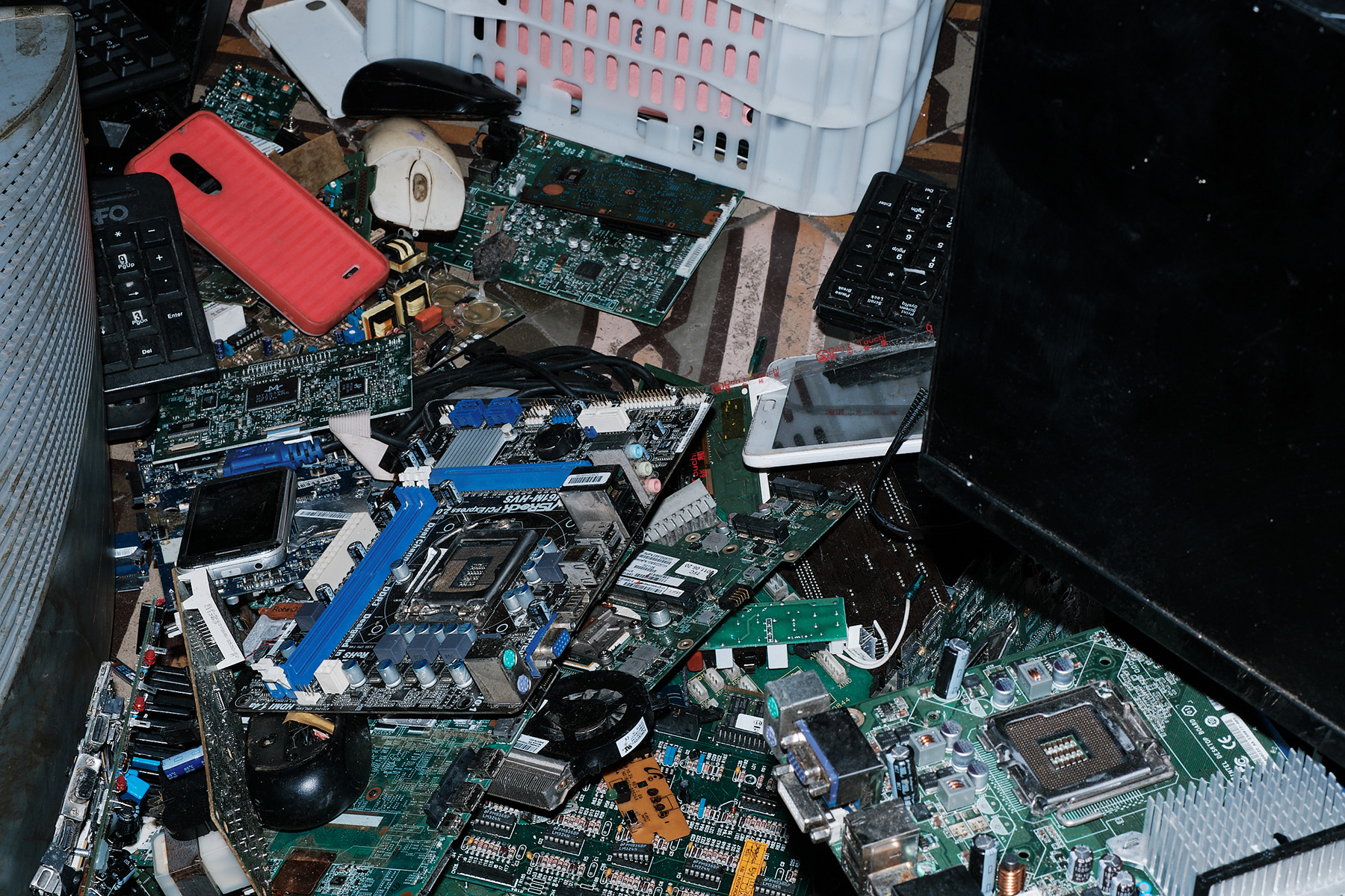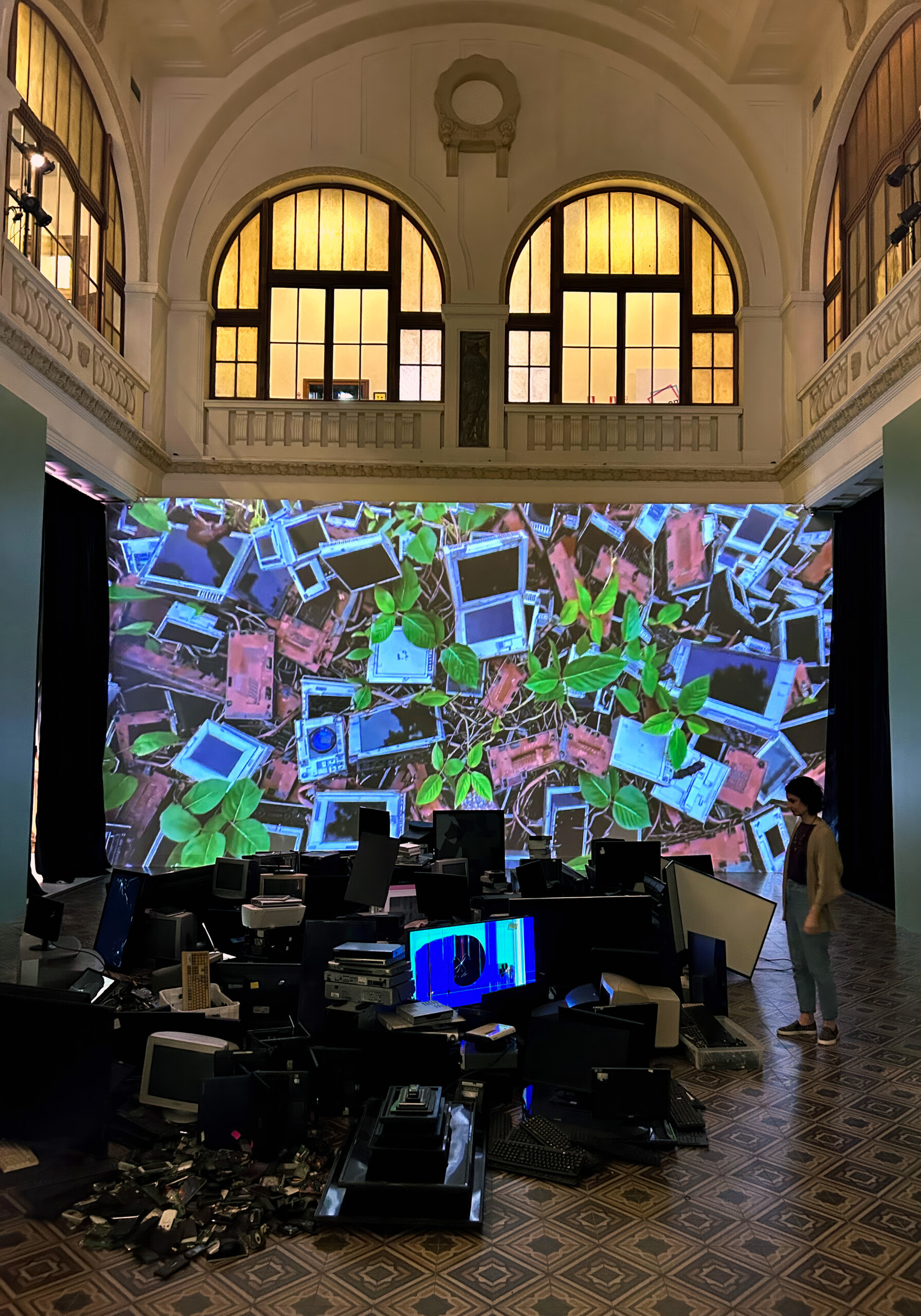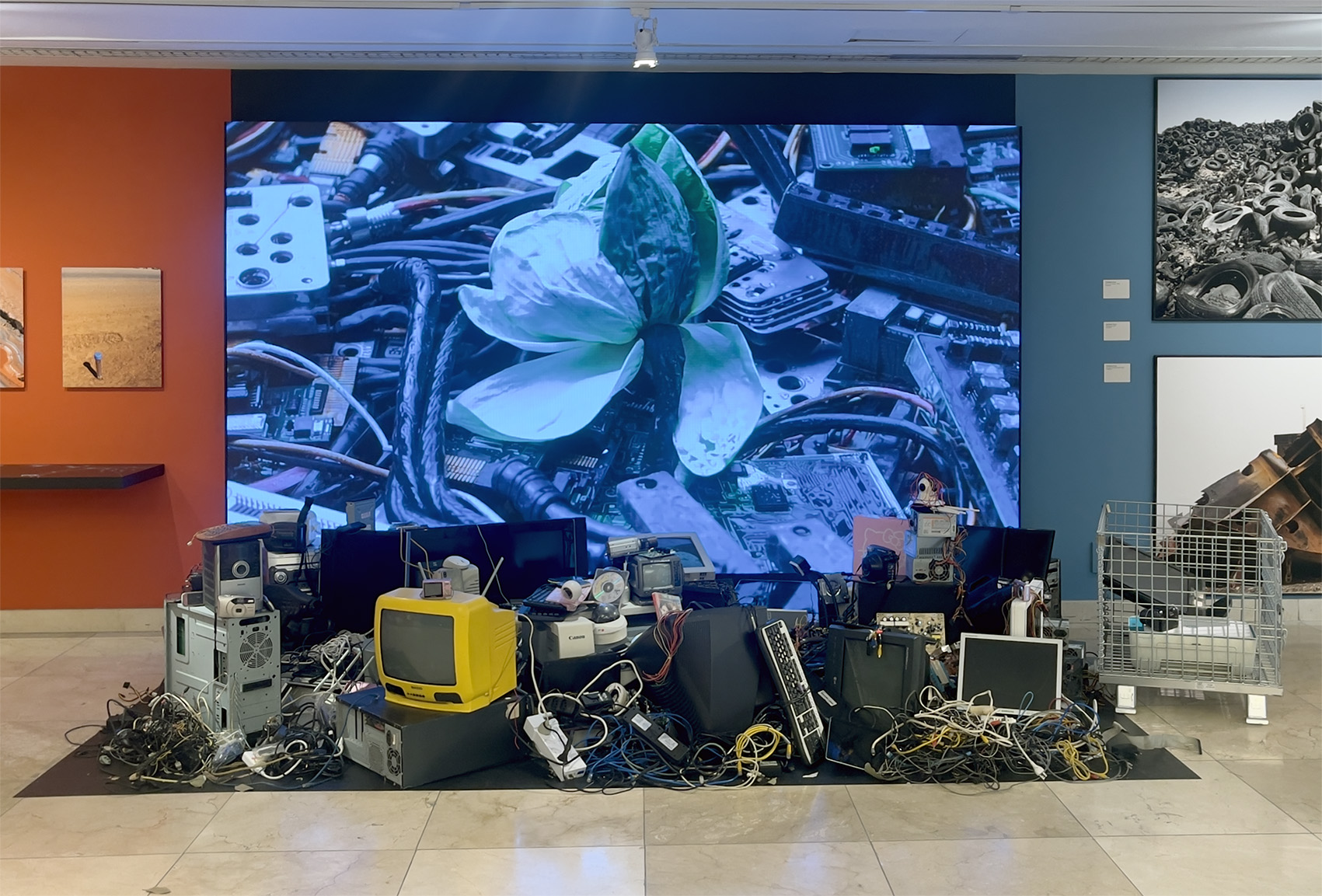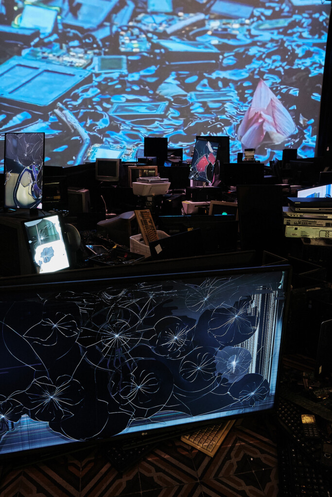 The e-waste donated by visitors is physically incorporated into the installation, forming a living — or dying — body that pulses between obsolescence and transformation. At the end of the exhibition, all collected material is sent for recycling, completing a symbolic cycle of exposure and decomposition.